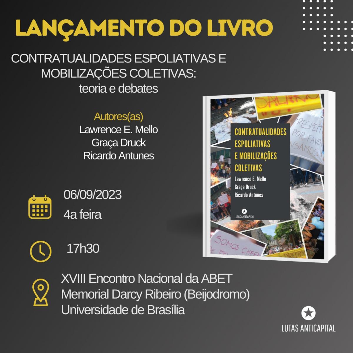 A professora Graça Druck e o professor Lawrence Estivalet de Mello, pesquisadores(as) do CRH/UFBA, lançarão o livro "Contratualidades espoliativas e mobilizações coletivas: teoria e debates", em coautoria com Ricardo Antunes (FFCH/Unicamp), com a presença dos três autores, no XVIII Encontro da ABET (Associação Brasileira de Estudos do Trabalho).